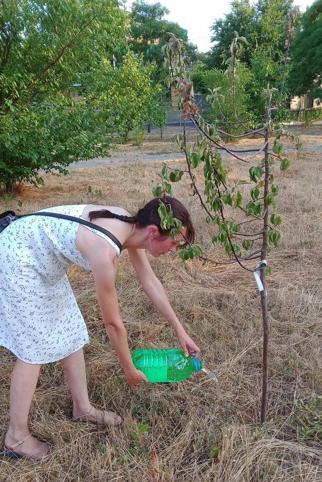 05.07.2025. Полив волонтерами саженцев деревьев в парке Кирова.