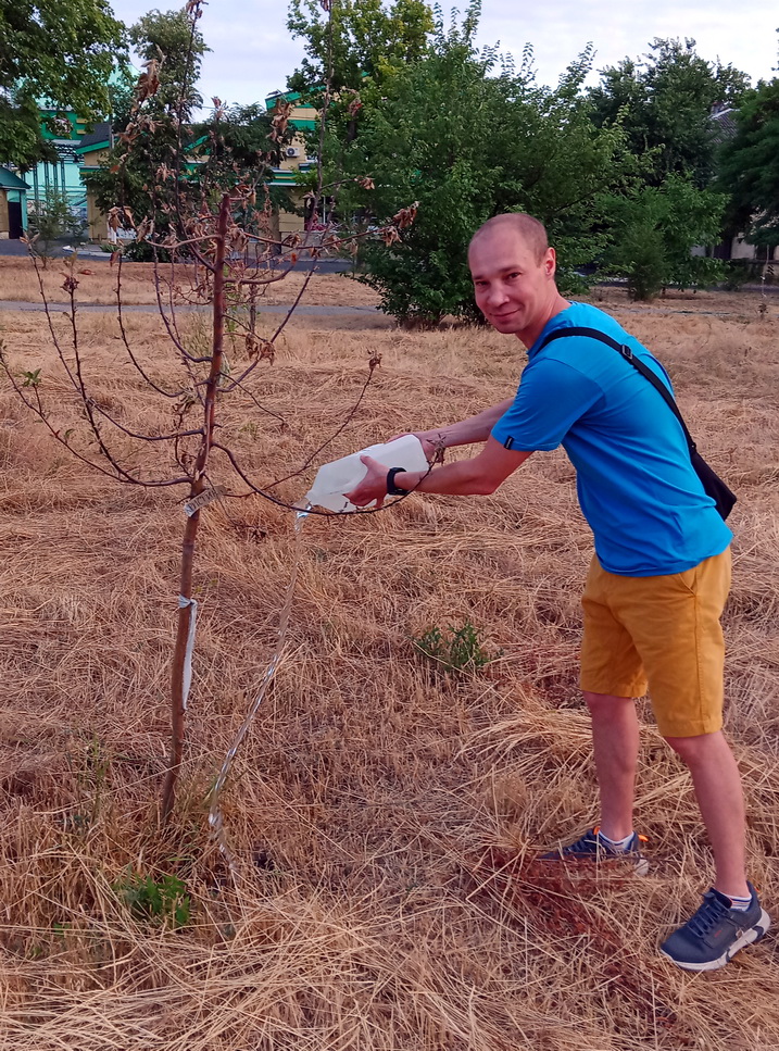 05.07.2025. Полив волонтерами саженцев деревьев в парке Кирова.