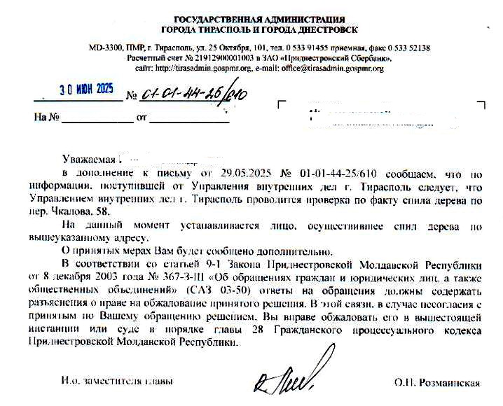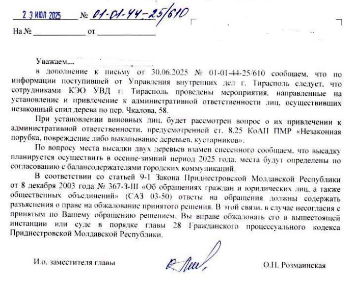 В ответ на письмо госадминистрации Тирасполя №01-01-44-25/640 от 23 июля 2025 года, в котором писалось о том что будет сообщено о результатах проверки факта незаконного спила дерева по пер. Чкалова 58.